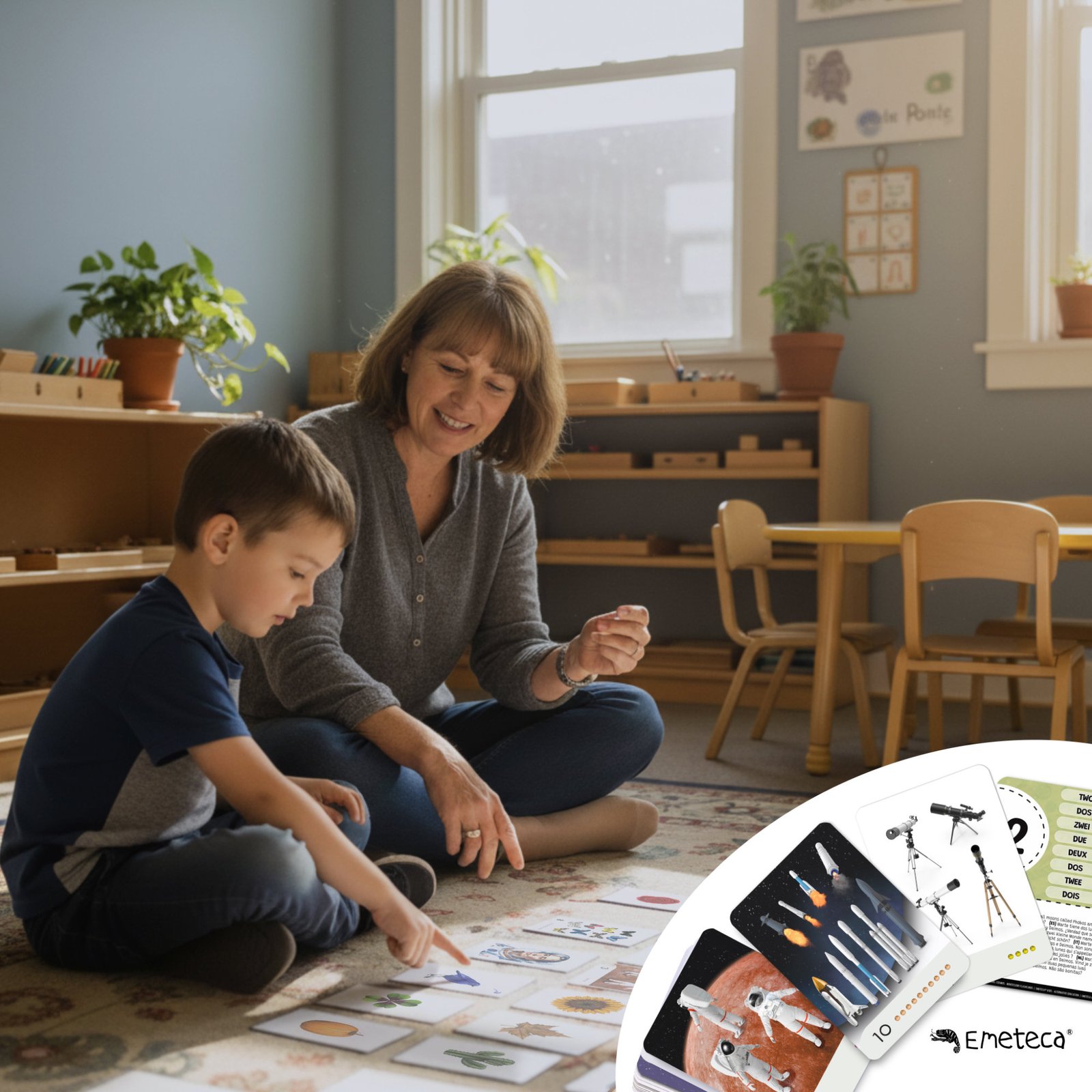 Cada tarjeta presenta una ilustración realista, diseñada para favorecer la atención y facilitar la asociación entre la cantidad, el número y la imagen. Están basadas en el sistema de perlas Montessori.