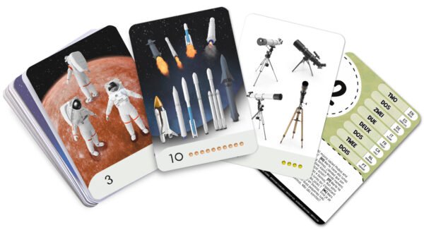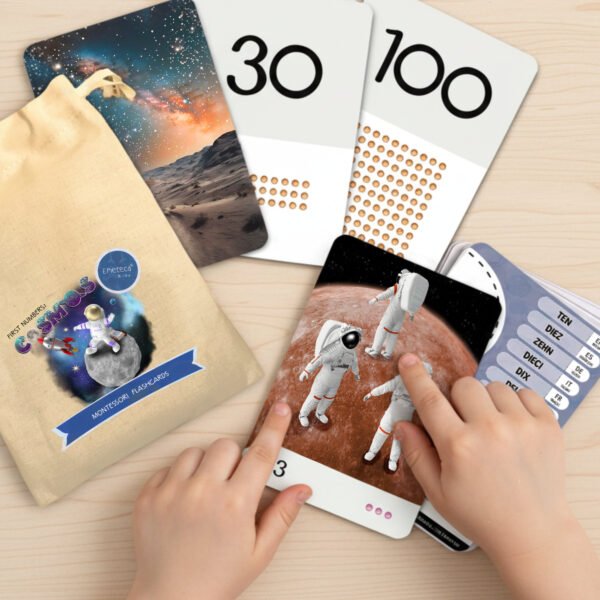 Set de tarjetas Montessori para aprender los primeros números, con ilustraciones realistas del Cosmos. Creadas para estimular la observación y el pensamiento lógico con un enfoque multilingüe.