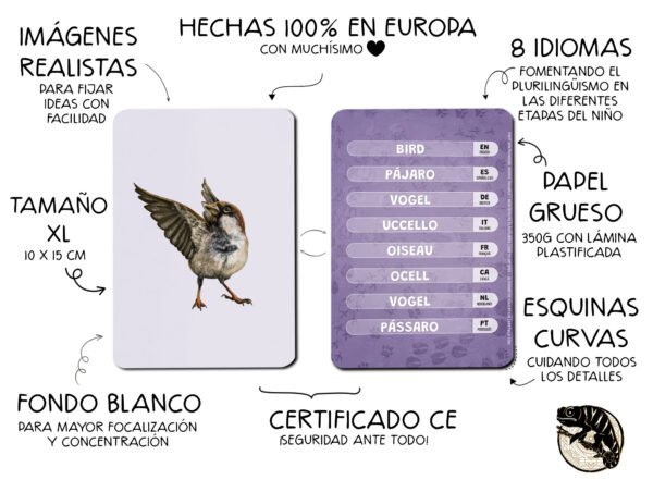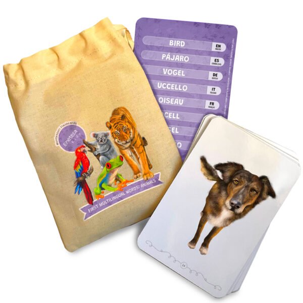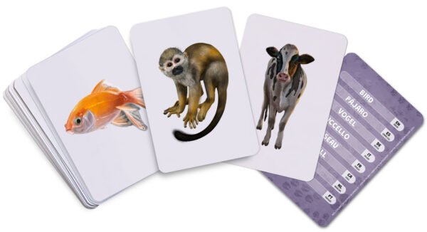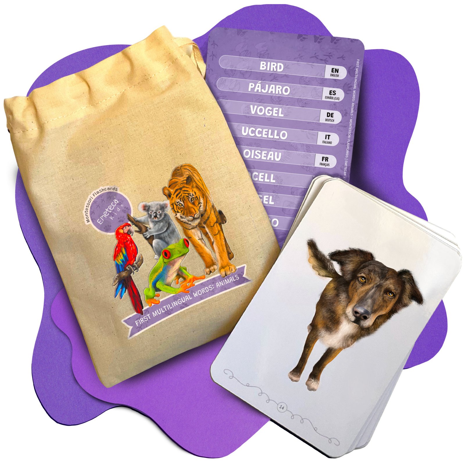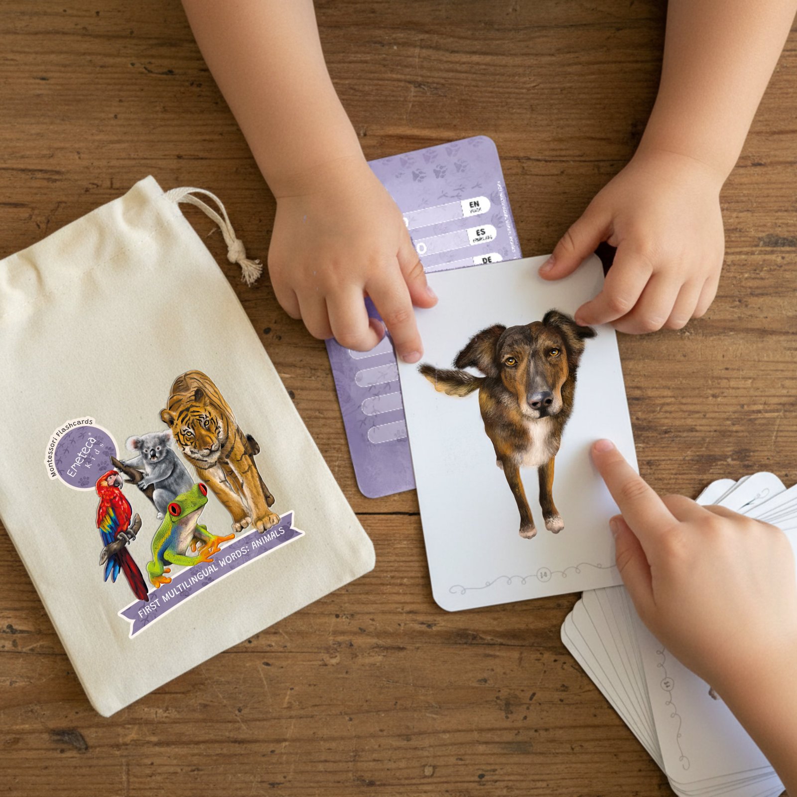 Set de tarjetas Montessori en 8 idiomas para aprender vocabulario, con ilustraciones realistas de animales. Aptas para las distintas etapas de la infancia gracias a su enfoque multilingüe.