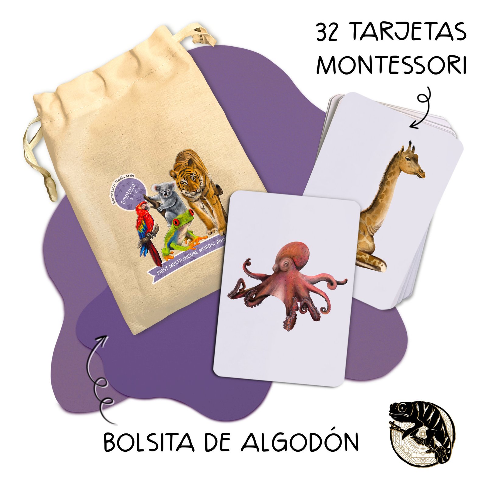 Este set de 32 tarjetas didácticas Montessori invita a los niños a descubrir el universo de los animales a través de imágenes realistas y vocabulario en ocho idiomas.