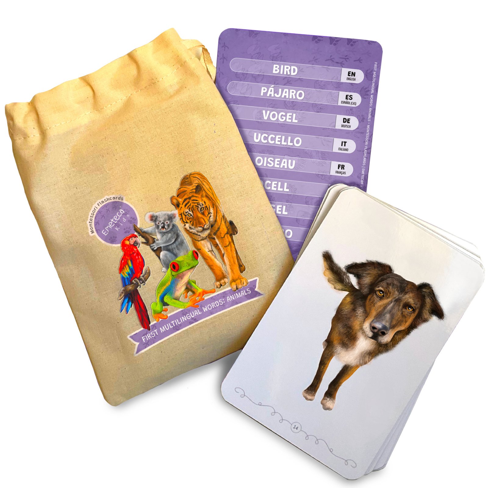 Tarjetas Montessori de Animales · Colección Primeras palabras multilingües · Emeteca Kids.
