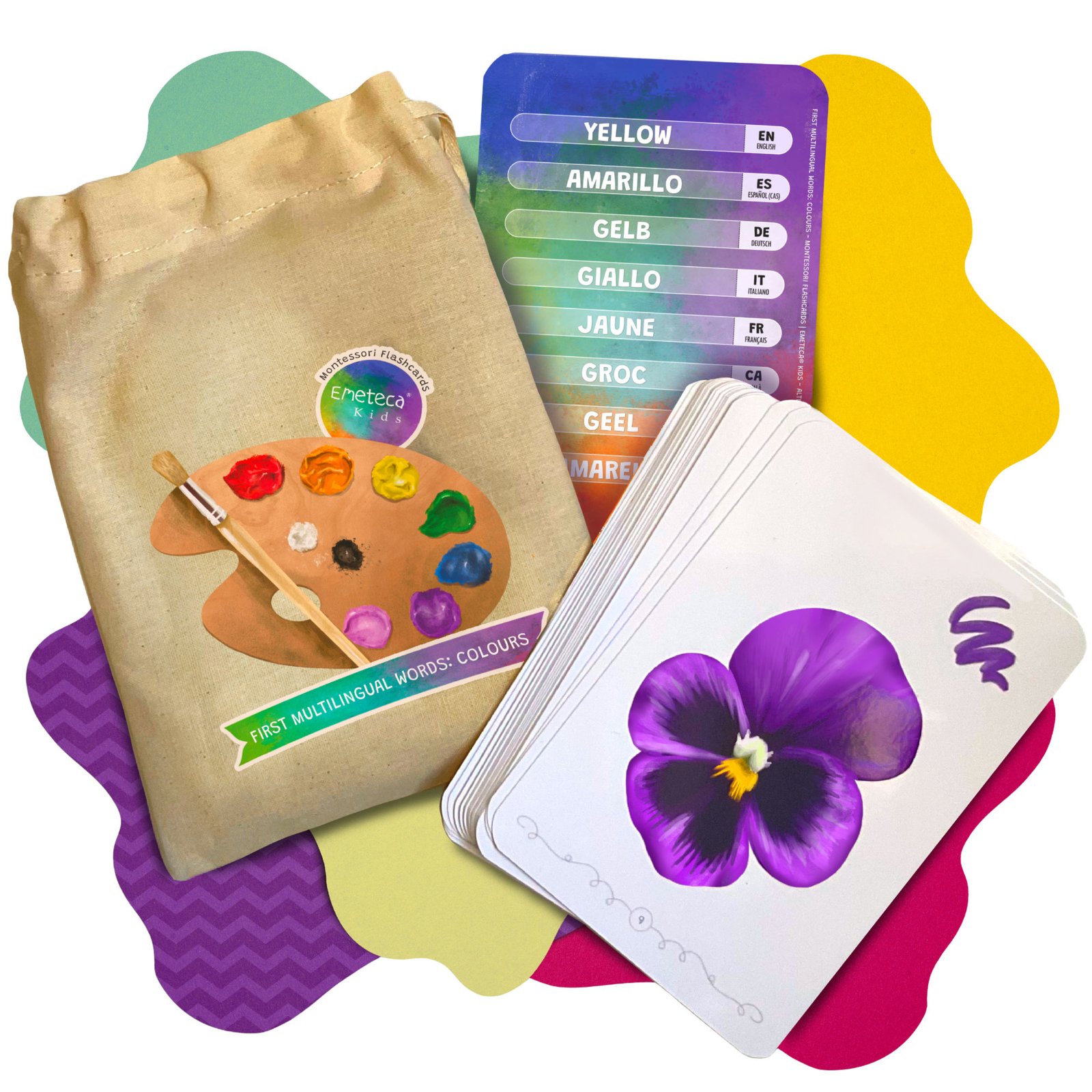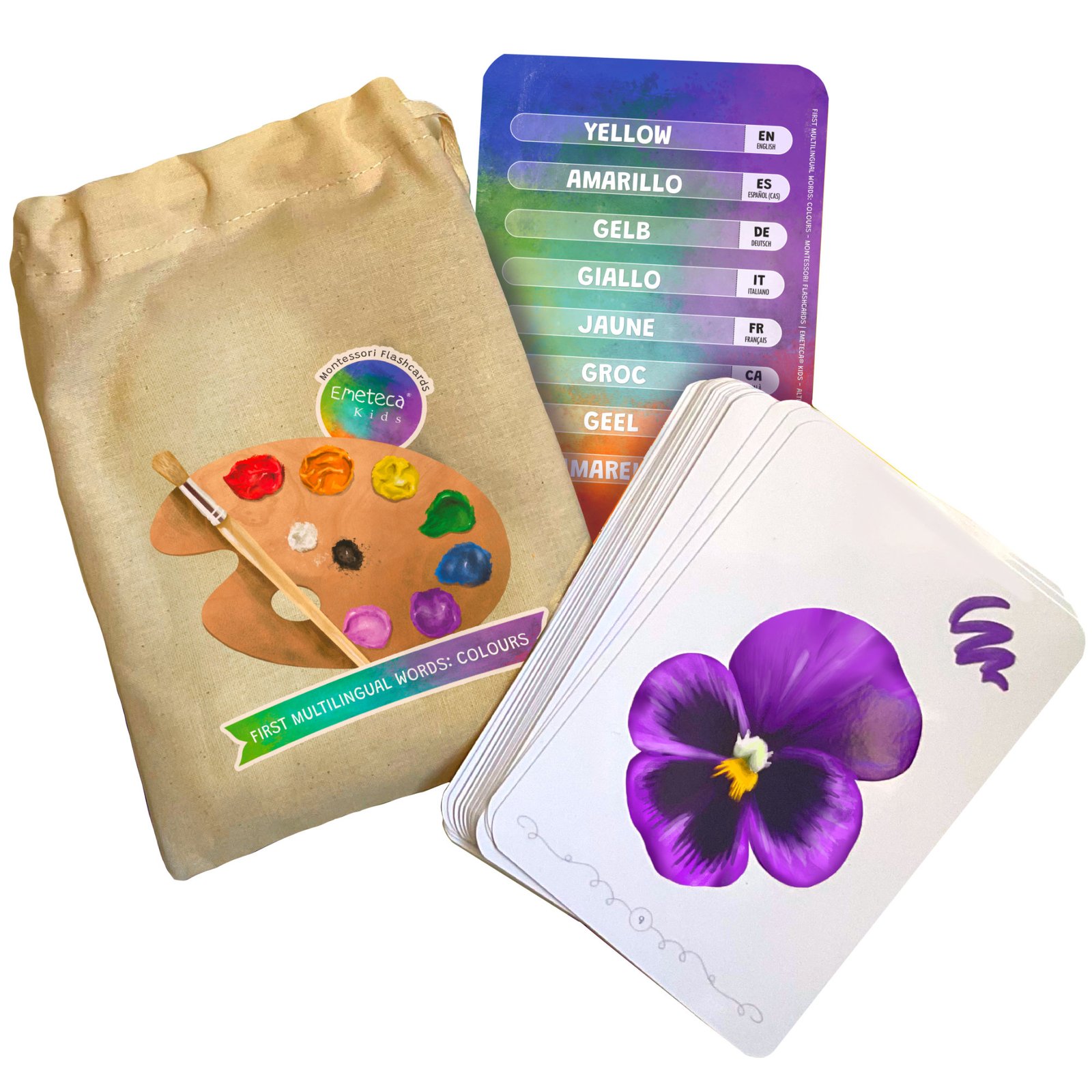 Tarjetas Montessori de los Colores · Colección Primeras palabras multilingües · Emeteca® Kids.