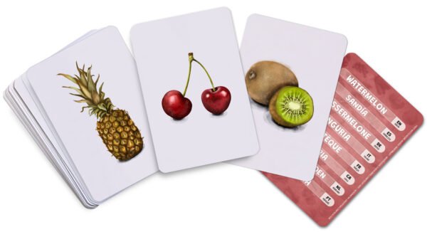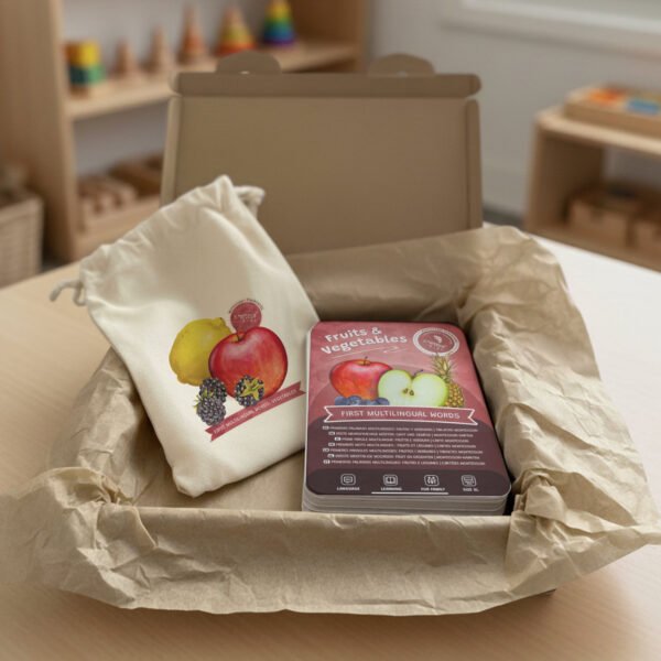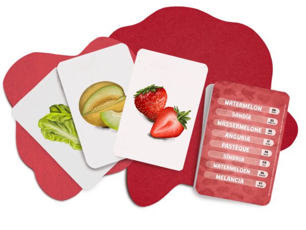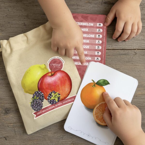 Set de tarjetas Montessori en 8 idiomas para aprender vocabulario, con ilustraciones realistas de frutas y verduras. Aptas para las distintas etapas de la infancia gracias a su enfoque multilingüe.