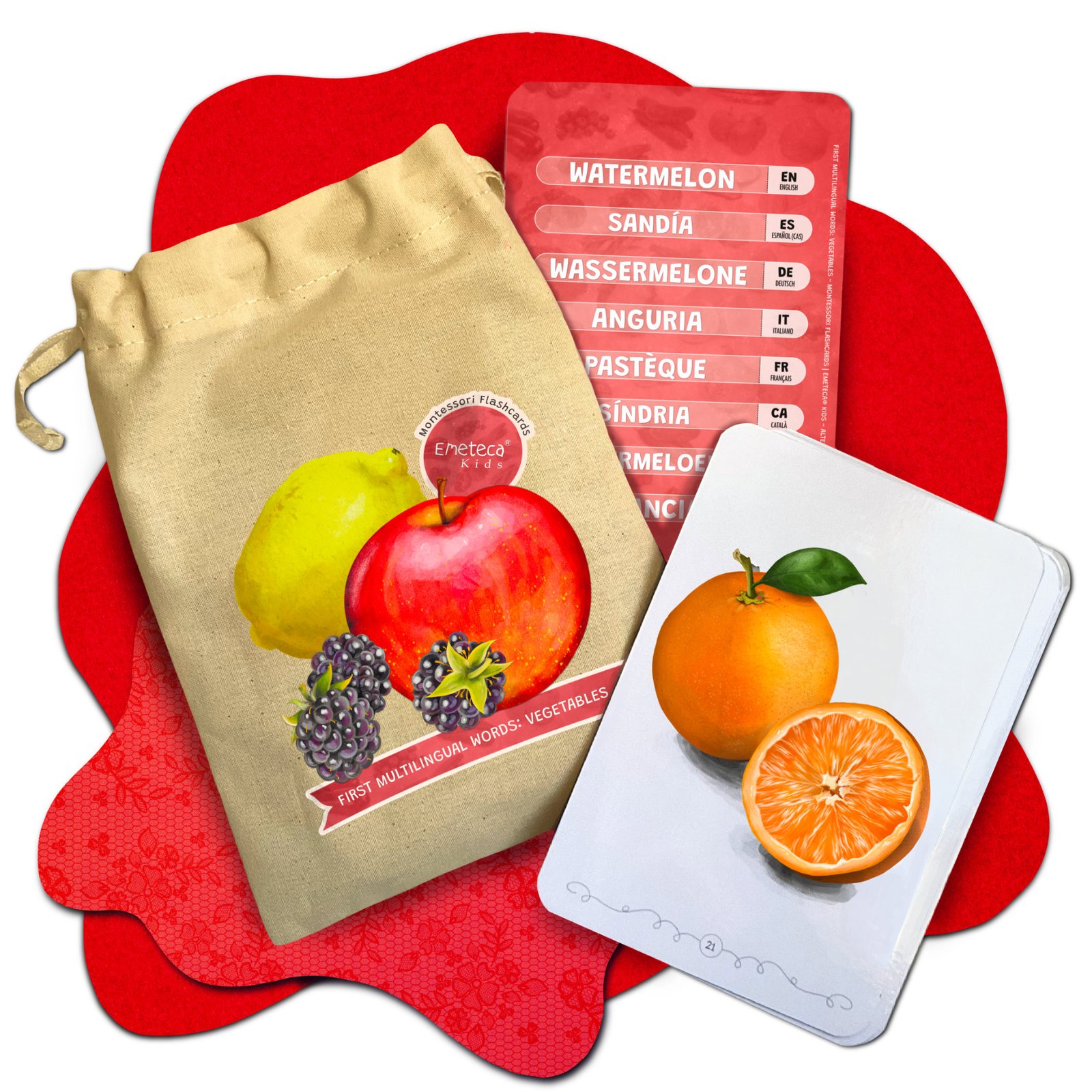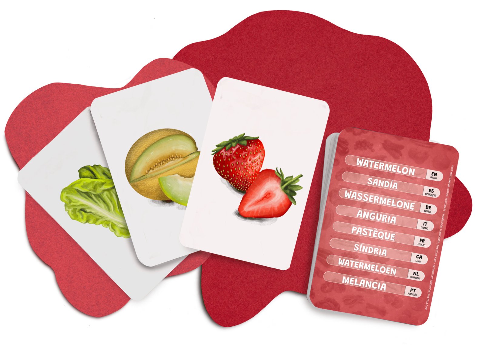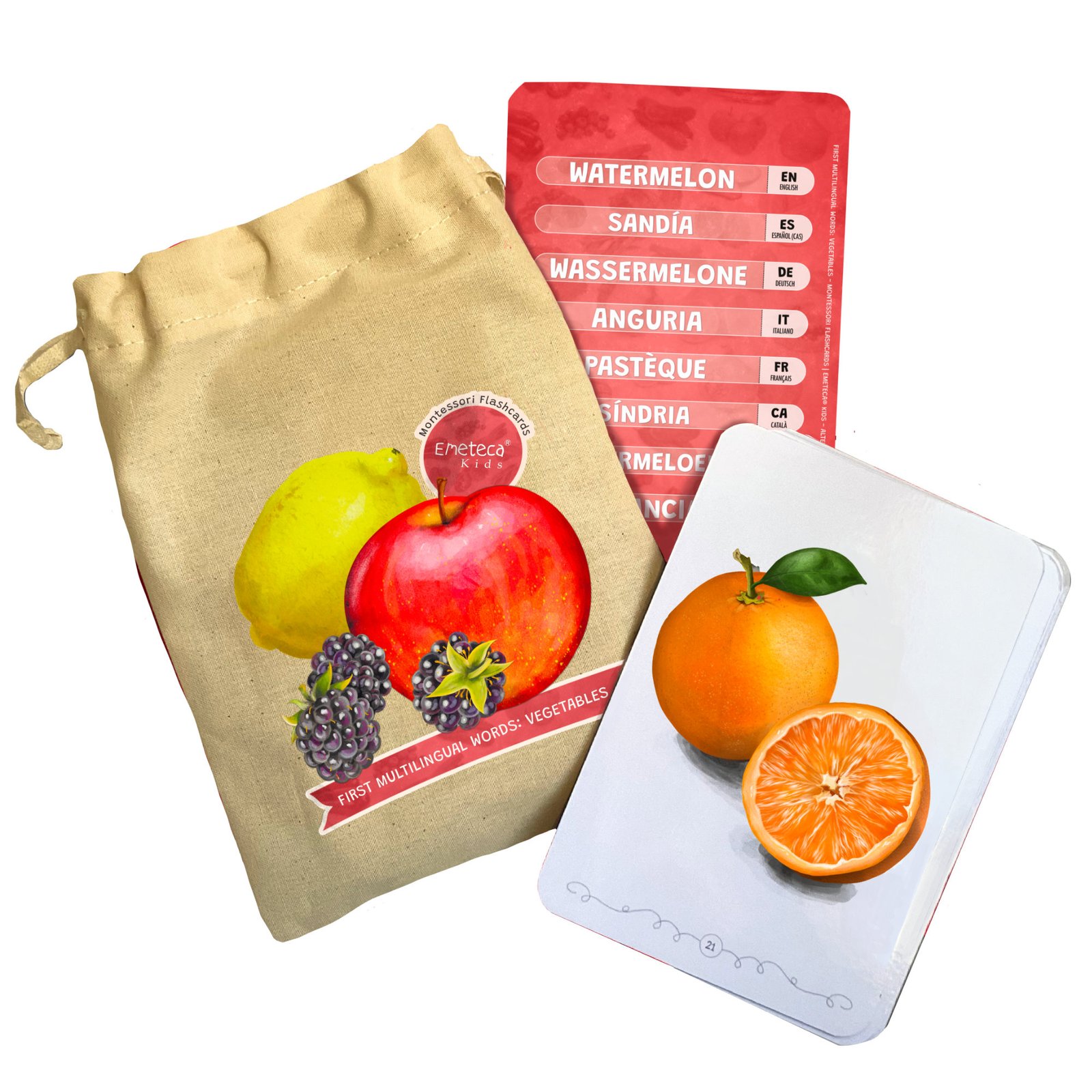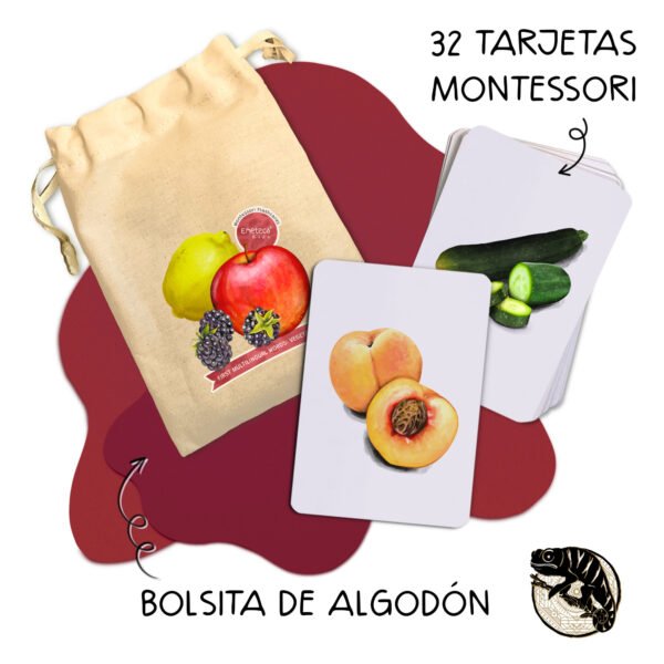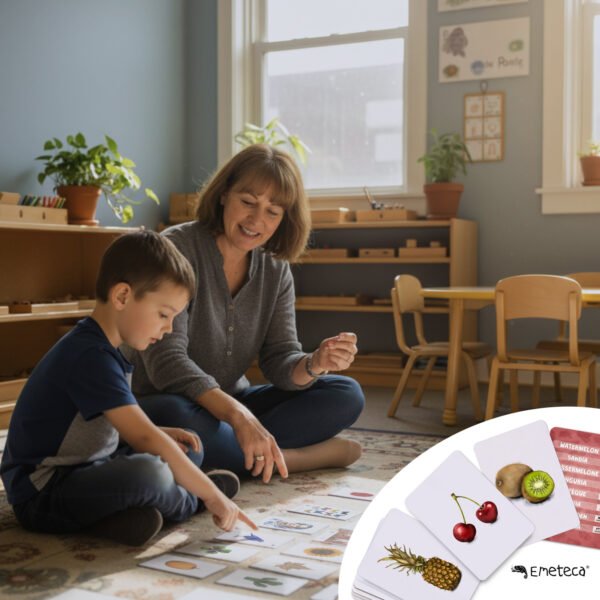 Tarjetas Montessori Frutas y Verduras · Colección Primeras palabras multilingües · Emeteca Kids.
