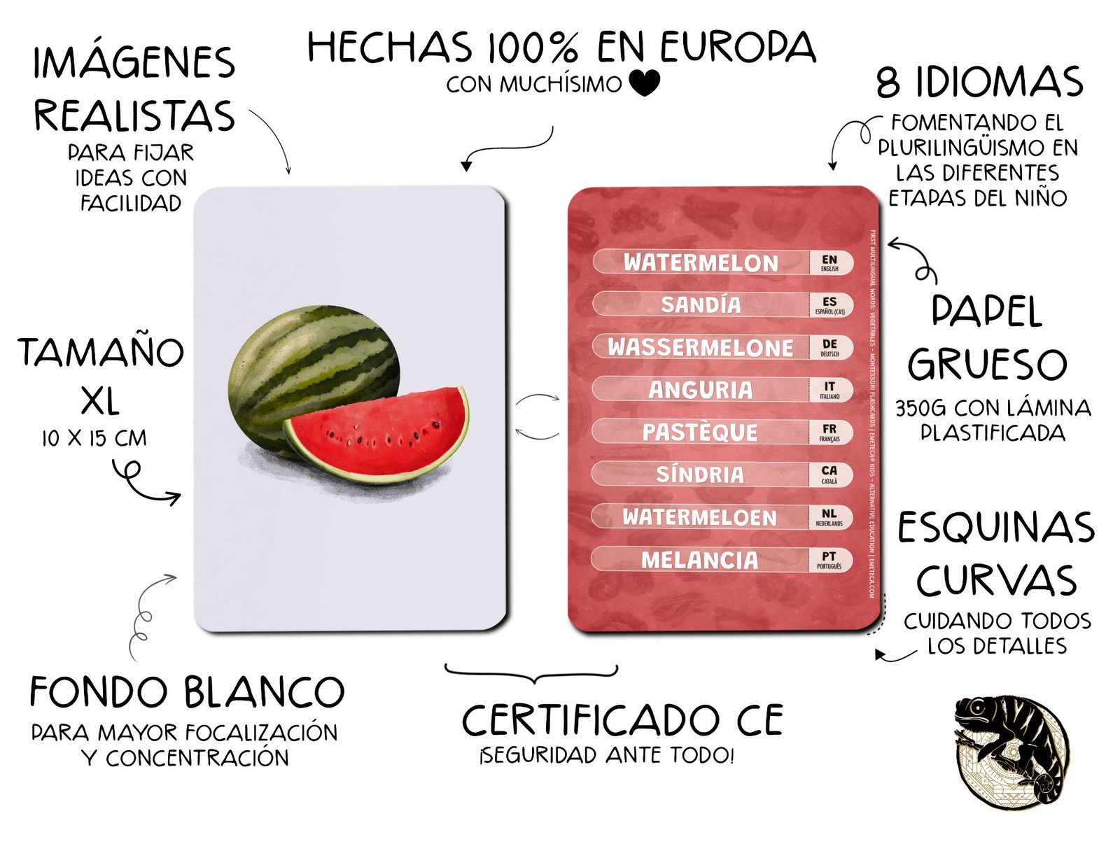 Incluyen el nombre del alimento en castellano, inglés, francés, alemán, italiano, catalán, portugués y neerlandés, para una primera aproximación al aprendizaje plurilingüe.
