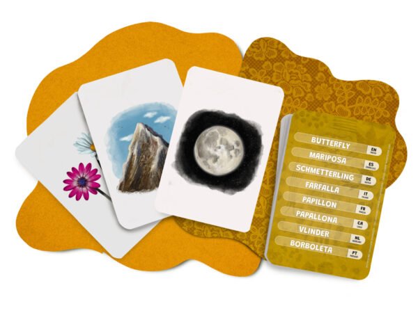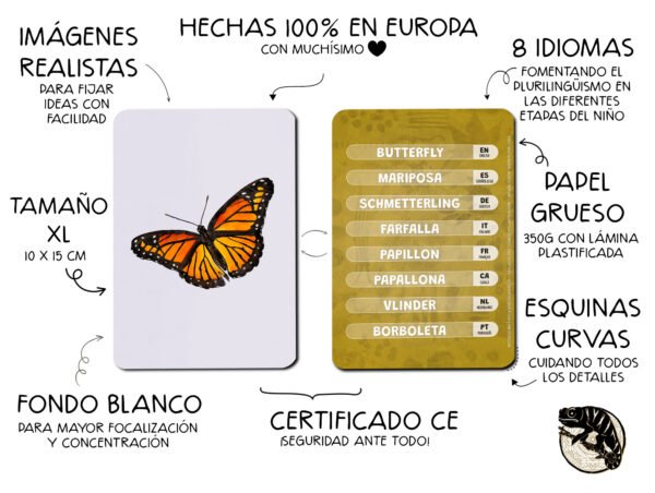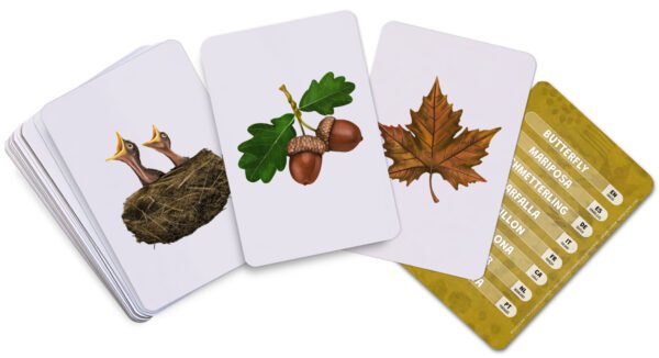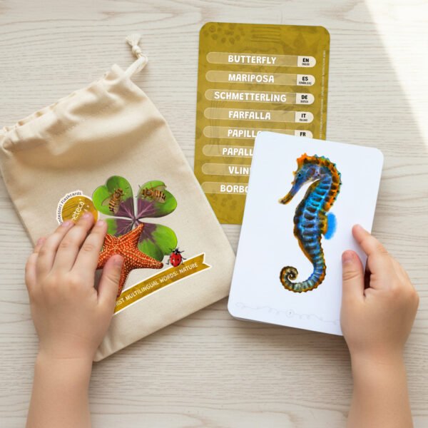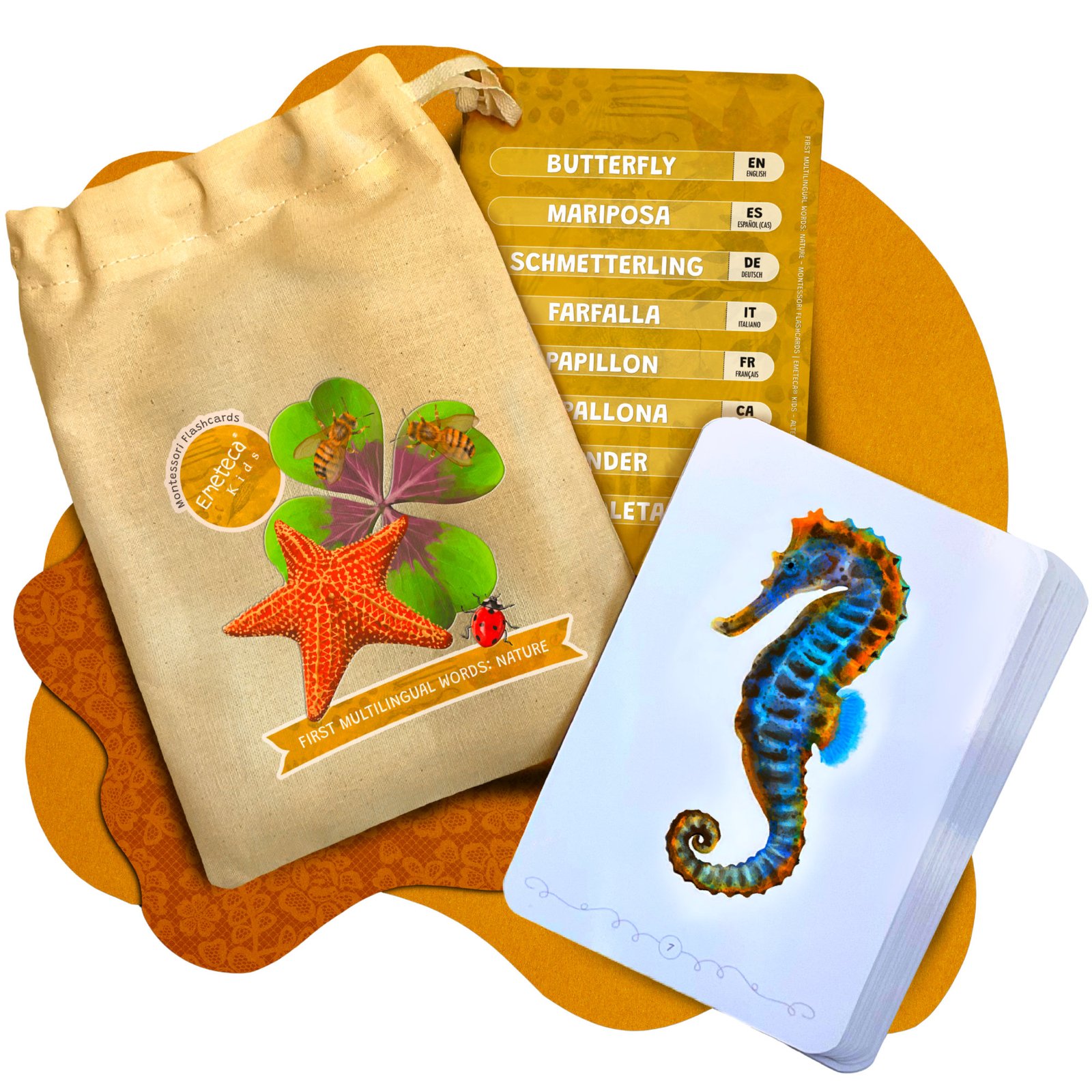 Set de tarjetas Montessori en 8 idiomas para aprender vocabulario, con ilustraciones realistas de la naturaleza. Aptas para las distintas etapas de la infancia gracias a su enfoque multilingüe.