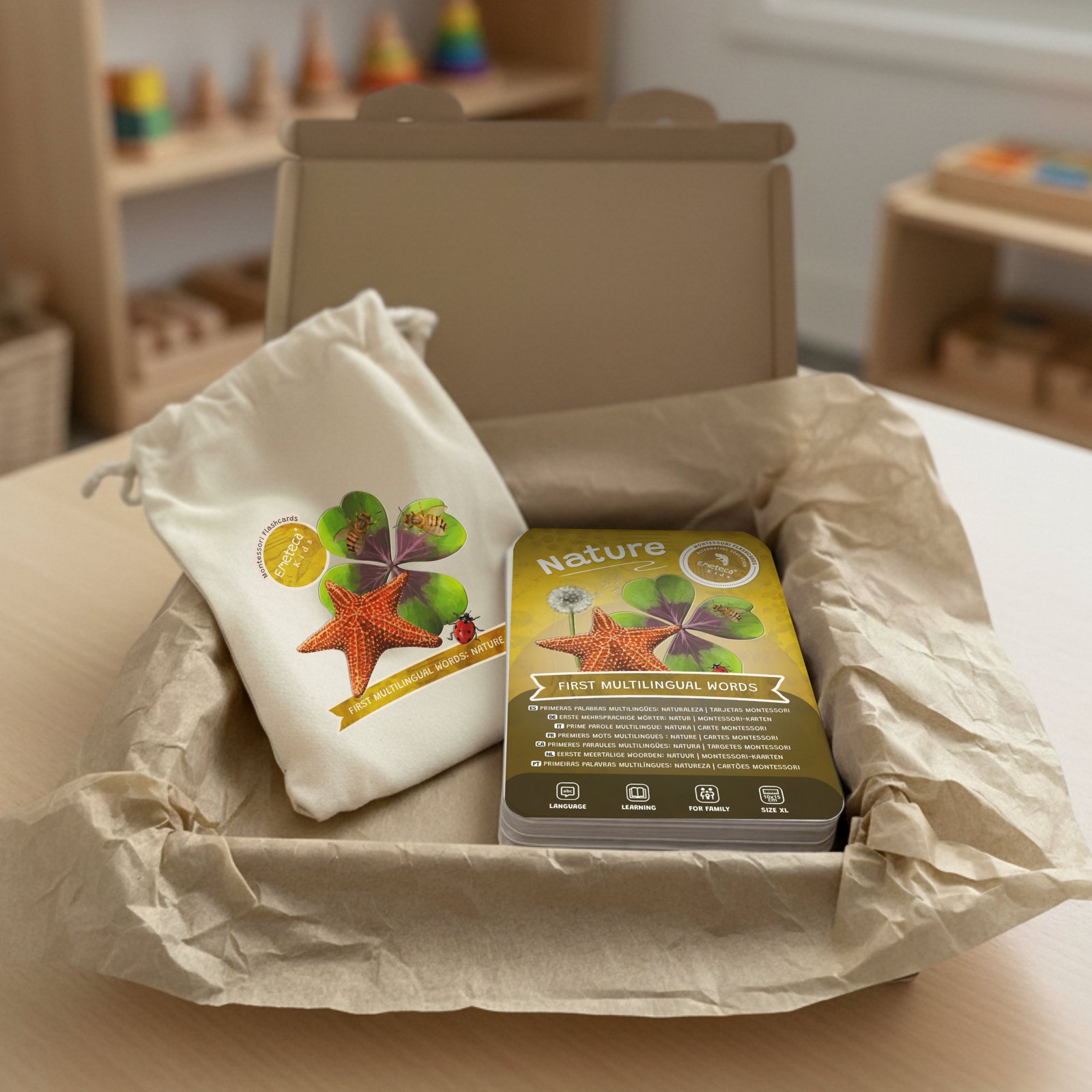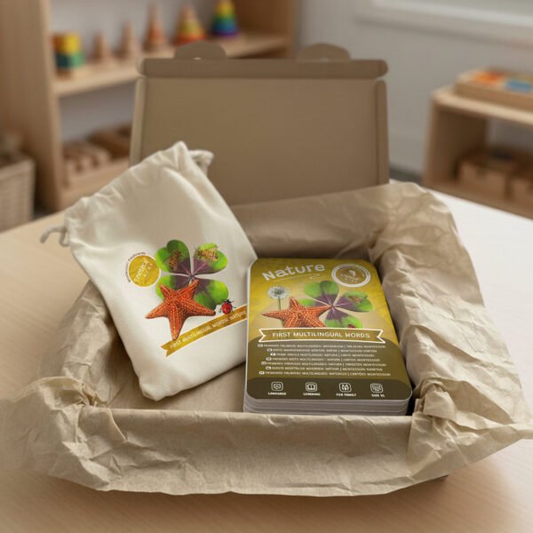 Las tarjetas de la colección Primeras palabras multilingües están basadas en la metodología Montessori, promoviendo la autonomía, la exploración y el aprendizaje a través de la experiencia visual y sensorial.