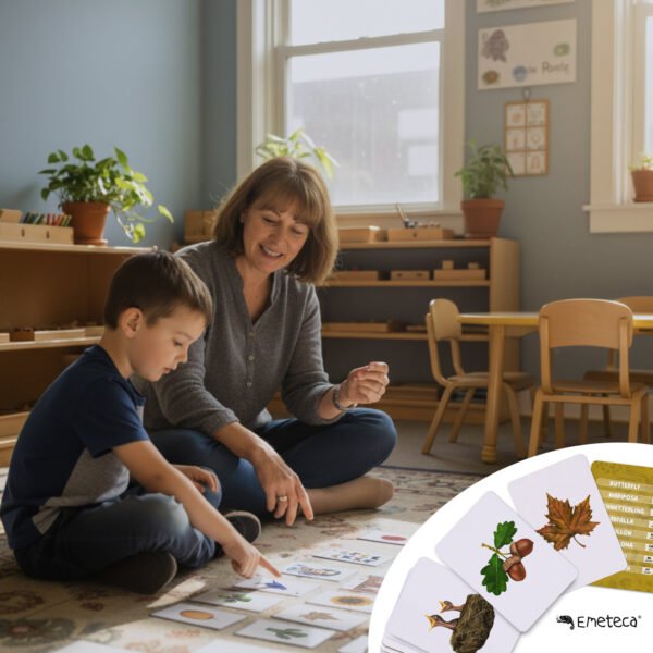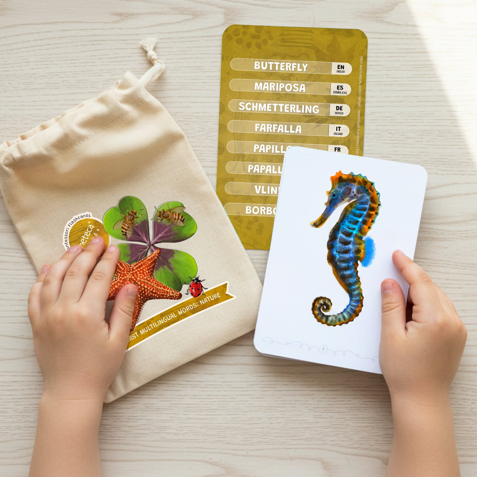 Este set de 32 tarjetas didácticas Montessori invita a los niños a descubrir el universo natural a través de imágenes realistas y vocabulario en ocho idiomas.
